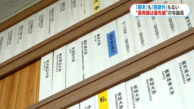 期末テストも朝課外もなし「当たり前」をなくした与論高校 ユニークな教育の背景に「島立ち」 南日本放送 2025年12月12日(金) 20:43 国内 廃止の成果は…名門大学の名前も 定期テストや朝課外の廃止で、成果は出たのか?学校の廊下には… (記者)「合格実績、東大って書いてありますね」 進学実績の欄には、東大や早稲田、同志社など名門大学の名前が並んでいます。