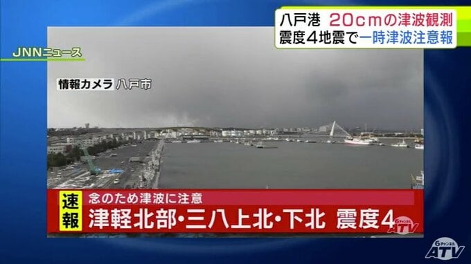「早く落ち着いて…」震度6強の地震から4日 またも青森県東方沖震源の地震で八戸市など『震度4』 一時「津波注意報」出され八戸港では20cmの津波観測 緊迫の避難の一部始終 中心街は閑散と【青森地震】 青森テレビ 2025年12月12日(金) 21:05 国内 またも地震… 最大震度6強の揺れ観測の地震から4日 12日午前11時44分ごろ、青森県東方沖を震源とする地震が起きました。 最大震度4を八戸市やむつ市など広い範囲で観測しました。地震から10分もたたずに、「津波注意報」が発表されました。 ♦この記事内の画像をもっと見る ♦記事を最初から読む