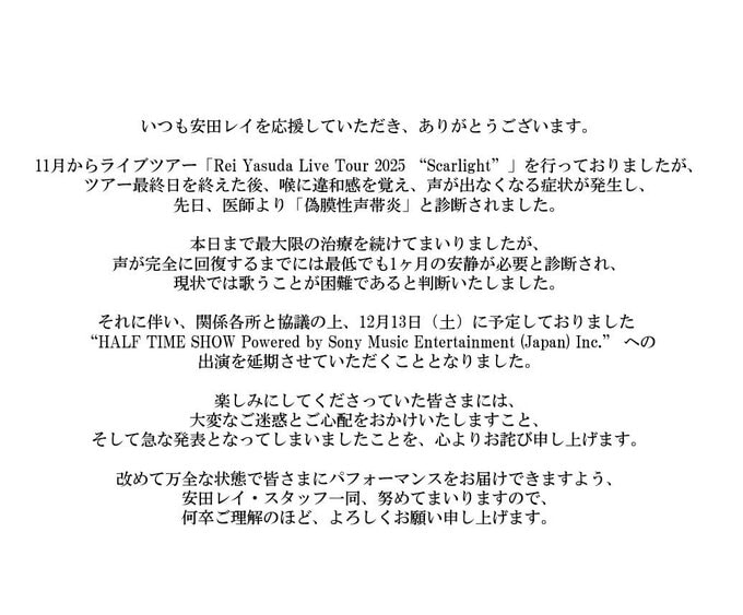 続けて、「本日まで最大限の治療を続けてまいりましたが、声が完全に回復するまでには最低でも1ヶ月の安静が必要と診断され、現状では歌うことが困難であると判断いたしました」と現状を伝え、「それに伴い、関係各所と協議の上、12月13日(土)に予定しておりました“HALF TIME SHOW Powered by Sony Music Entertainment (Japan) Inc.” への出演を延期させていただくこととなりました」と伝えました。