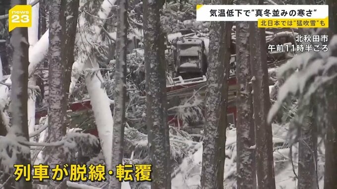 雪が降るなか、秋田県では列車が脱線し、転覆する事故も。列車に乗客はおらず、50代の男性運転士が病院に運ばれましたが、命に別状はないということです。運営会社は、事故の原因について、現時点では倒木に衝突したと考えられるとしています。