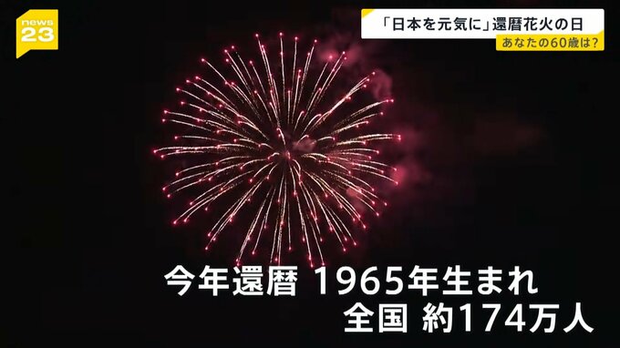 キレイな赤い花火が夜空に打ちあがります。2025年の還暦は、1965年生まれ、全国約174万人です。