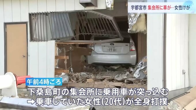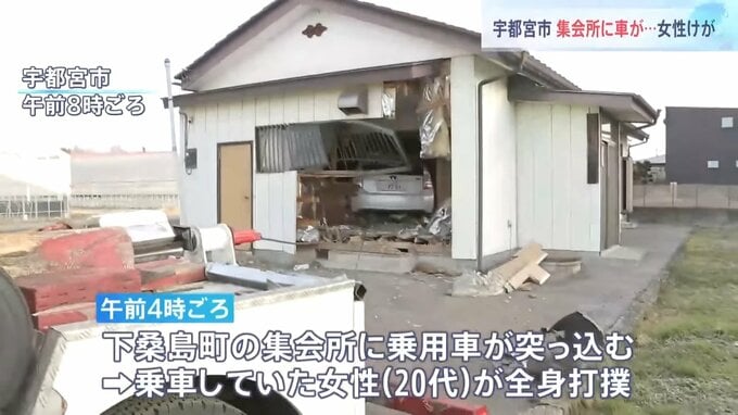 宇都宮市の集会所に車突っ込む 乗っていた20代女性が全身打撲「運転していたのは男性で、事故後に立ち去った」 To view this video please enable JavaScript, and consider upgrading to a web browser that supports HTML5 video TBSテレビ 2025年12月13日(土) 09:02 国内 町の集会所に乗用車が突っ込む 宇都宮市下桑島町で午前4時ごろ、町の集会所に乗用車が突っ込みました。 警察などによりますと、車に乗っていた20代の女性が全身を打撲したということです。 当時、集会所には誰もおらず、ほかにけが人はいませんでした。