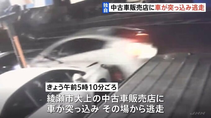 きょう未明、神奈川県綾瀬市の中古車販売店に車が突っ込み、その場から逃走しました。店の防犯カメラがその瞬間をとらえていました。