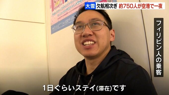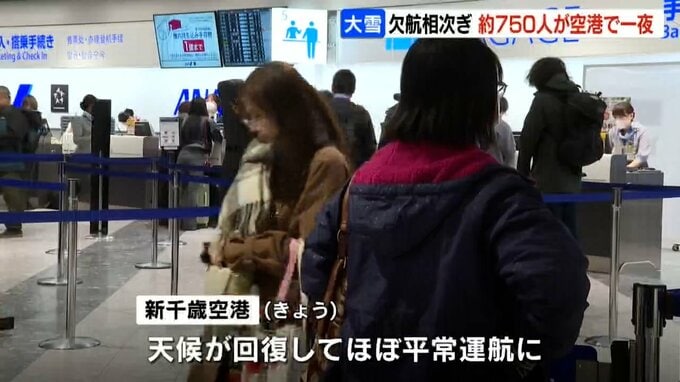 12日、雪の影響で183便が欠航した新千歳空港ではおよそ750人の乗客が空港内で一夜を明かしました。
