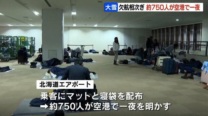 このため、北海道エアポートは空港内にとどまった乗客に床に敷くマットと寝袋を配布し、およそ750人が空港内で一夜を明かしました。