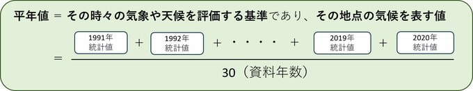 気象庁では、その時々の気象(気温、降水量、日照時間等)や天候(冷夏、暖冬、少雨、多雨等)を評価する基準、あるいは地点での気候を表す値として「平年値」を算出しています。
