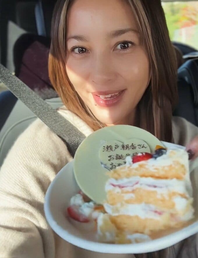 移動中の車内で瀬戸さんが手にしたお祝いのケーキには、『瀬戸朝香さん お誕生日おめでとうございます』のメッセージが添えられています。