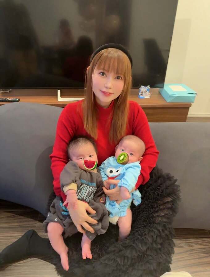 翔子さんは、赤いニット姿で双子を膝に抱く3ショット写真を投稿。「風船であやすとキャッキャって声あげて笑ったり」「顔をじーっとみたり」「日々成長があってすごいなぁ」「いましかない瞬間を見逃したくないなぁ」と、実感を込めて語っています。
