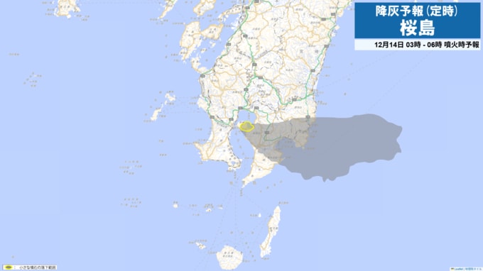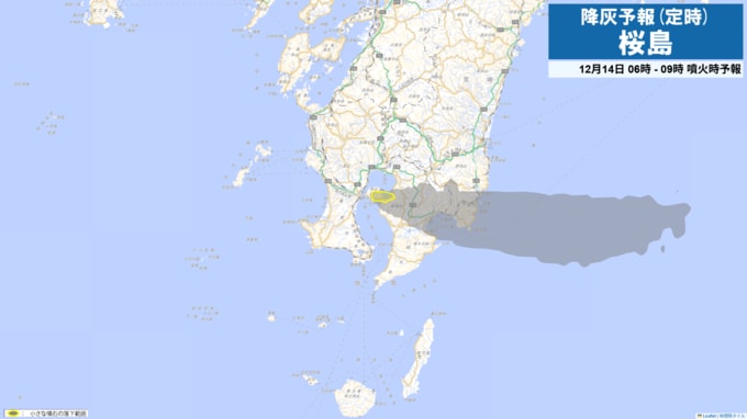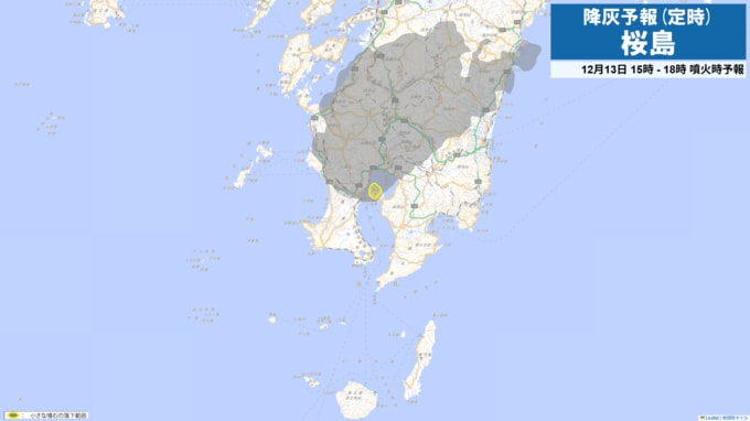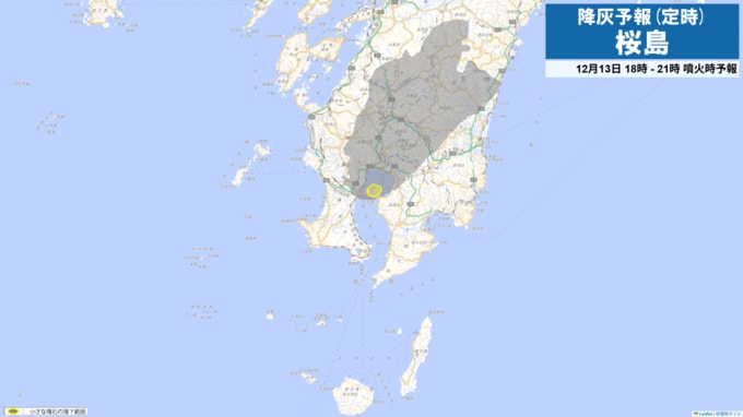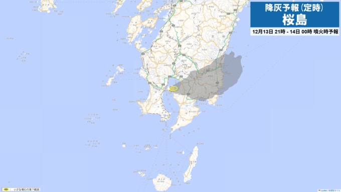 桜島で噴火が発生した場合には、13日21時から24時までは火口から東方向に降灰が予想されます。 13日15時から14日9時までに噴火が発生した場合には、以下の方向・距離に降灰及び小さな噴石の落下が予想されます。