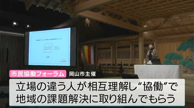 立場を越えて、子育てしやすい地域づくりを目指そうというフォーラムが岡山市北区の能楽堂ホールtenjin9で開かれました。