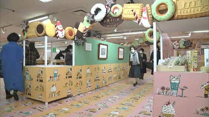 4回目となる今年のテーマは「お菓子の家」。クッキーなどの装飾を施し、ワクワクする空間を演出しています。また、歴代の天満屋の制服や、かつて天満屋の屋上にあった観覧車をモチーフにした会場限定商品も並びます。