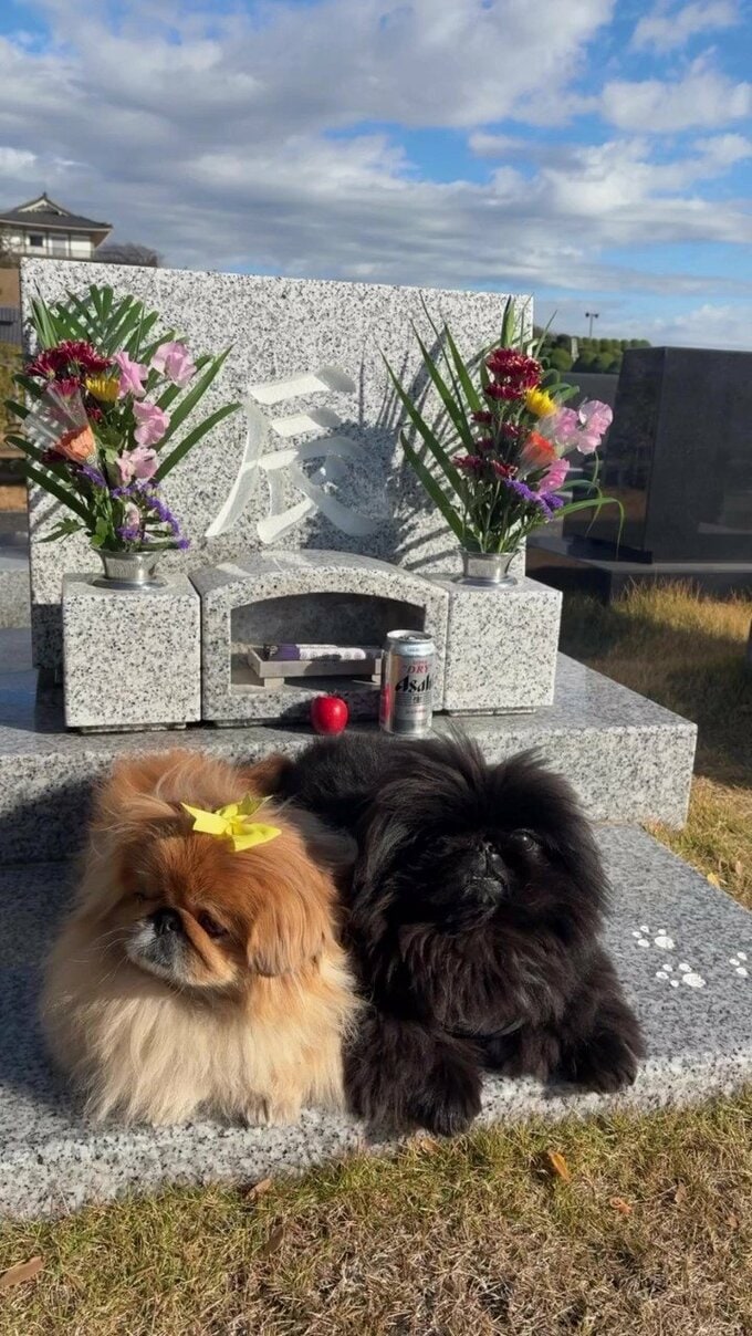 辰夫さんが家族に囲まれる写真が続き、最後はアンナさんが辰夫さんの墓標に愛犬たちと共に訪れたカットで締めくくられています。