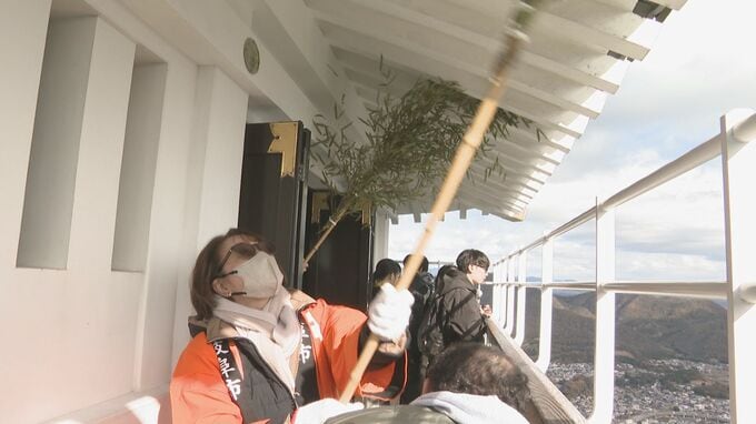 年末恒例の岐阜城天守閣のすす払いは、例年、岐阜市の職員が行ってきましたが、ことしは初めて一般の参加者を募り、抽選で選ばれた市民など6人が参加しました。