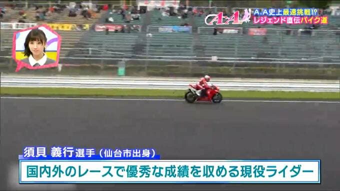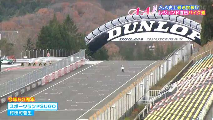 宮城県の豊かな自然に囲まれたこのサーキットで、バイクに一度も乗ったことのない東北放送アナウンサーの佐藤朱アナが、現役最高齢ライダーという"レジェンド"の指導のもと、人生初のバイク挑戦に挑みました。