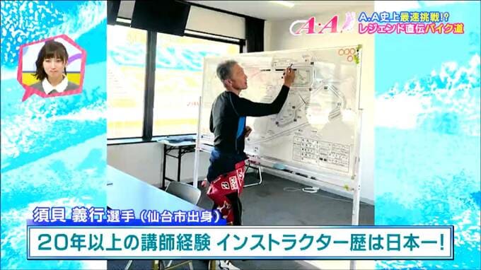 佐藤朱アナ:「今日はレジェンド須貝のバイク道に入門し、基本を学び、数々の課題をクリアしてお墨付きをもらえば、チャレンジ成功です」