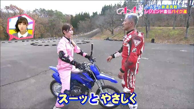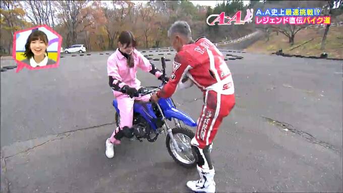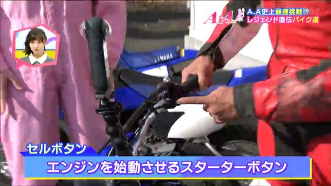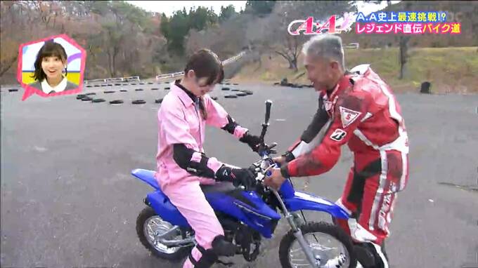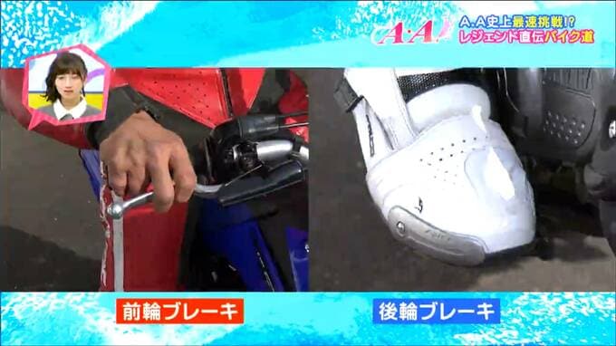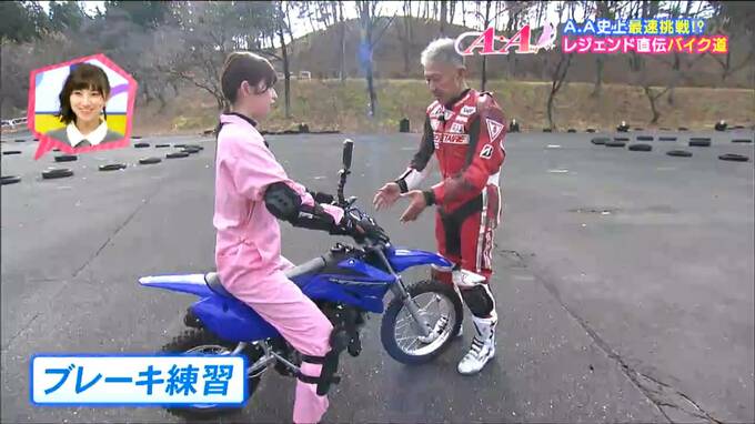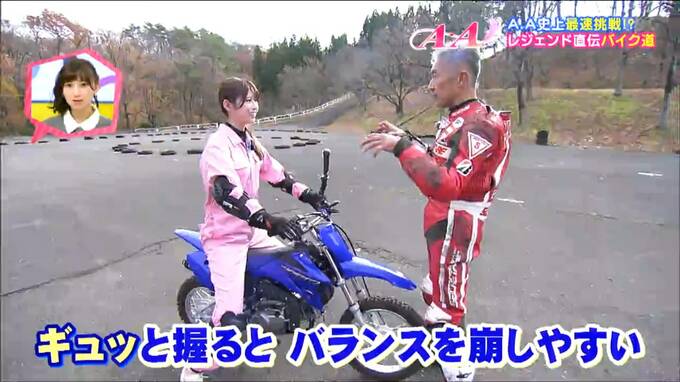 動き出したバイクに驚き、佐藤アナが思わずブレーキレバーを強く握りしめ、バイクがガクンと止まり、体が前のめりになってしまいました。