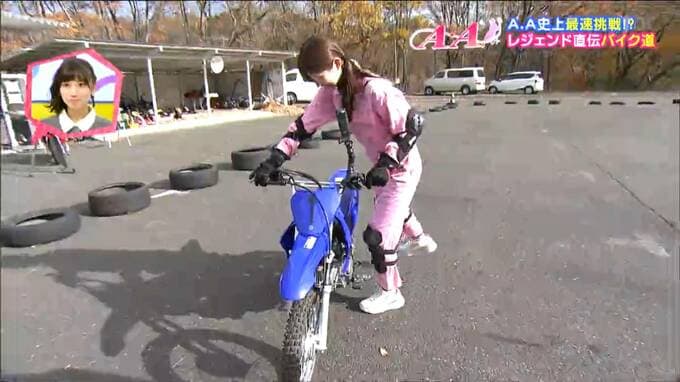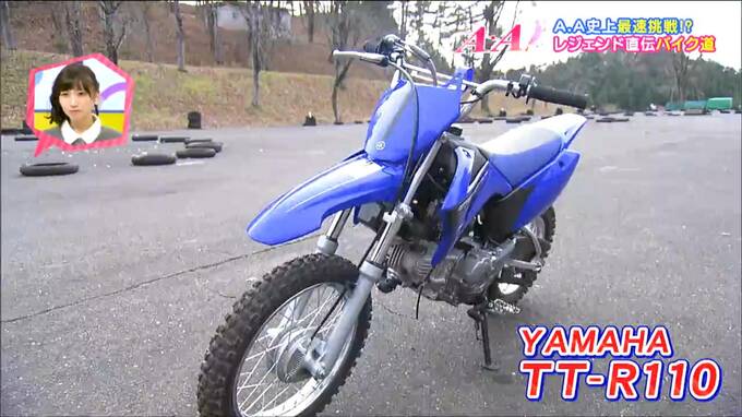 須貝選手が用意したのは、ヤマハの110ccの小型オフロードバイク。青い車体に黒いシートを備えた、初心者にも扱いやすい車種です。
