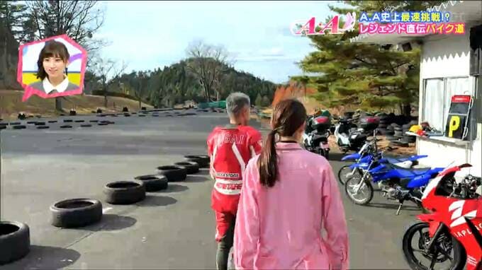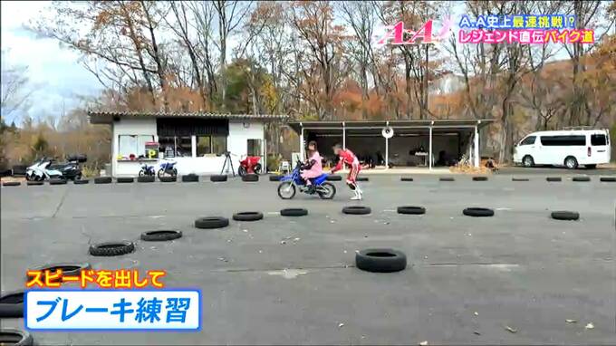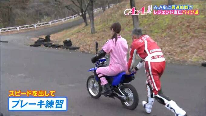 須貝選手がバイクを後ろから押し、佐藤アナは、ハンドルを握ってバランスを取る。須貝選手:「『はい』って言ったら、ブレーキをかけてくださいね」