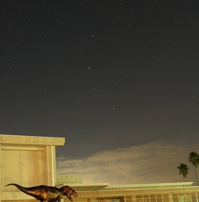 さらに恐竜のオブジェと流星の共演もが一緒に捉えられており、太古のロマンと冬の天体ショーが融合したような幻想的な光景となりました。
