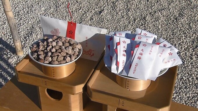 京都の北野天満宮では、正月の縁起もの「大福梅」の配布が始まりました。 梅の名所として知られる京都の北野天満宮で配られているのは、正月の縁起もの「大福梅」です。 境内で摘み取った梅の実を塩漬けにして天…
