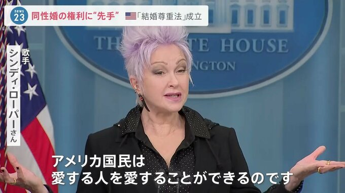 また、性的マイノリティーの人たちを支援する歌手のシンディ・ローパーさんも、法律の成立を歓迎しました。