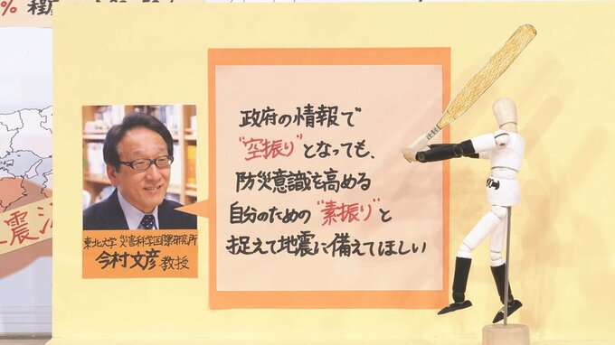 今村教授は「政府の情報で“空振り”となっても、防災意識を高める自分のための“素振り”と捉えて地震に備えてほしい」と話しています。