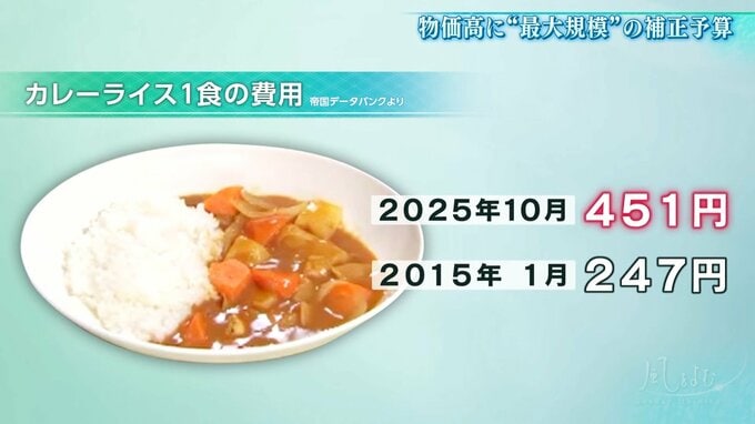 カレーライス1食をつくるのに必要な食材や水道光熱費から算出する、「カレーライス物価指数」。1食あたりの費用が451円と、10年で2倍近くに。背景にあるのが、コメや野菜に加え、輸入牛肉などの価格上昇でした。