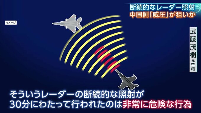 「今の新しいレーダーは、捜索もしながら追尾できるという能力を持っている。そういうレーダーの断続的な照射が、30分にわたって行われたのは非常に危険な行為。攻撃される可能性を含んでいる。鉄砲で言えば、引き金に指をかけているような状況の可能性。相手の意図は断定できないが、威圧するような行為だった可能性も」