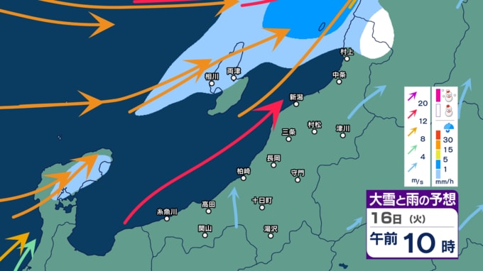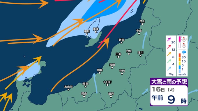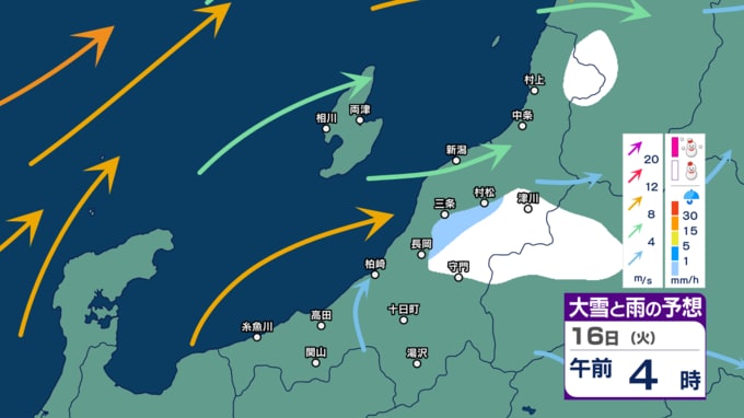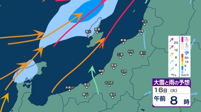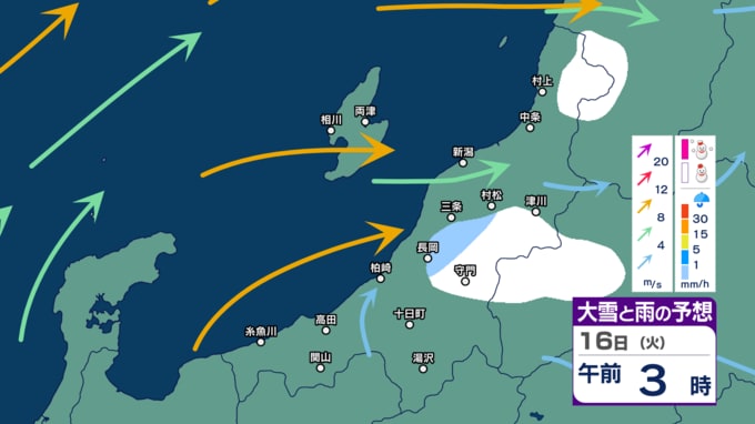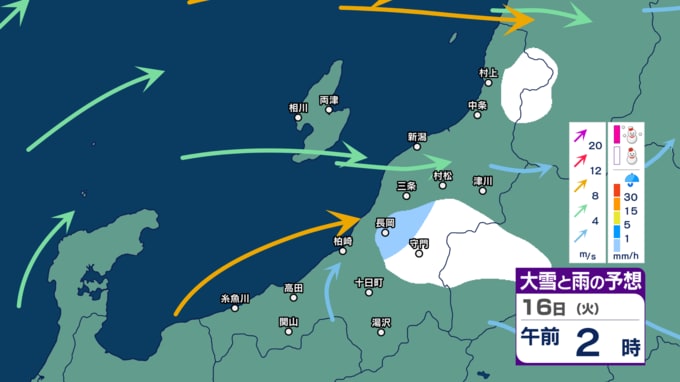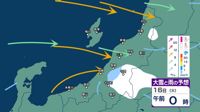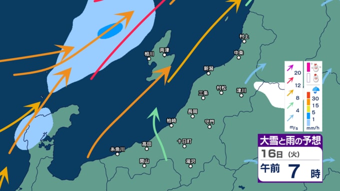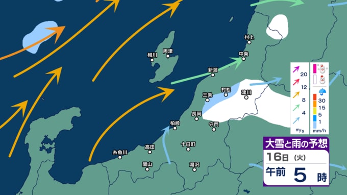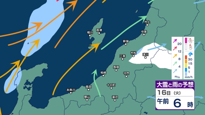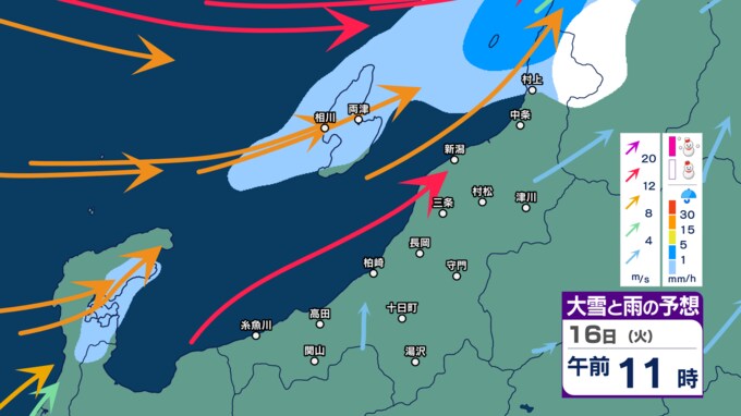新潟県内はあす15日未明にかけて暴風に警戒 下越・佐渡では15日昼前にかけて高波にも警戒【今後の雨・雪と風のシミュレーション・14日午後7時更新】 新潟放送 2025年12月14日(日) 19:02 16日(火)午前0時~11時の雨・雪と風のシミュレーション