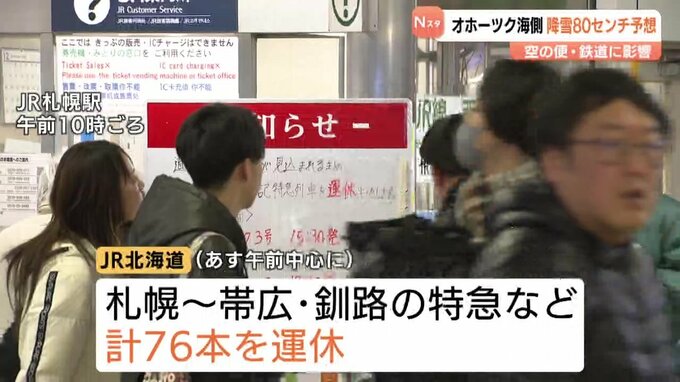 JR北海道は14日、札幌と網走や釧路を結ぶ特急など合わせて59本を運休に。