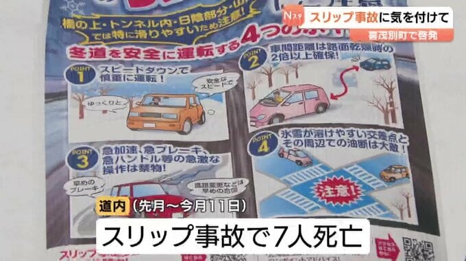 道内では11月から12月11日にかけてスリップ事故で7人が死亡していて、警察はスピードダウンを心掛けるほか、十分な車間距離を確保するよう呼びかけています。