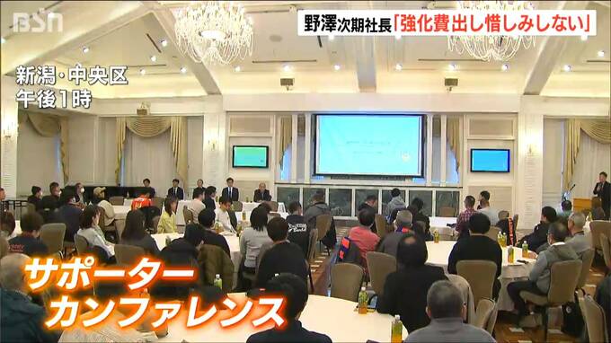 新潟市中央区で14日、アルビレックス新潟のサポーターカンファレンスが開かれ、野澤次期社長は「強化費は出し惜しみしない」と決意を語りました。