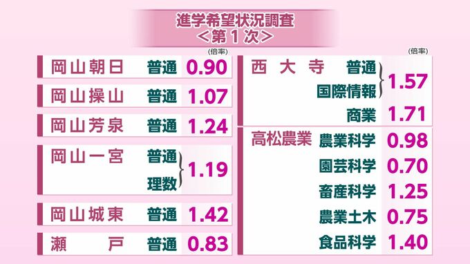 岡山県内の中学校を来年春に卒業する見込みの生徒を対象にした、第1次進学希望調査がまとまりました。全日制県立高校の平均倍率は1.03倍で、昨年同時期(1.07倍)より下がっています。