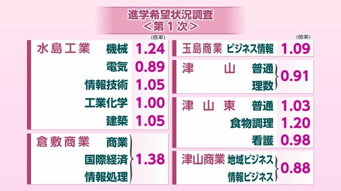 倉敷商業は1.38倍、水島工業(機械)は1.24倍と高い倍率となりました。そのほかの高校・学科は【画像⑤】の通りです。