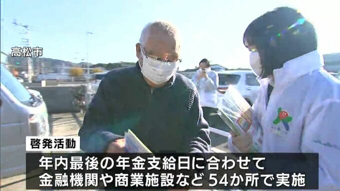 啓発活動は年内最後の年金支給日にあわせて、県内の金融機関や商業施設など54か所で一斉に行われたものです。このうち高松市にあるJAの直売所では、警察官らがチラシを配り、被害防止を呼びかけました。