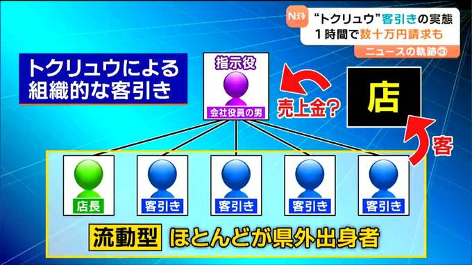店長や客引きは流動型でほとんどの人物が県外出身者。指示役のもと違法な経営をしていた店に客を呼び込み、ぼったくりをしていたということですが組織の全容はまだ捜査中で明らかになっていません。
