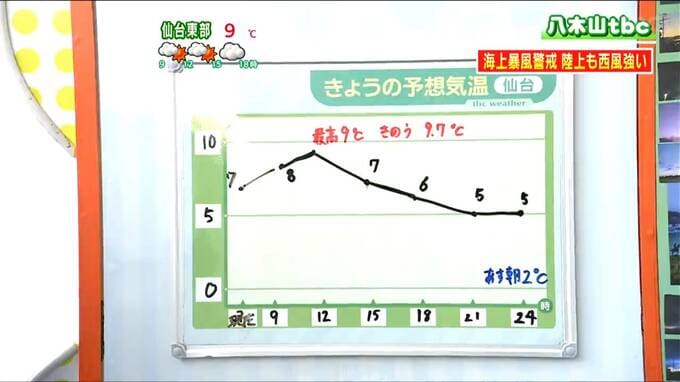 時間ごとの気温推移を見ると、午前9時頃が7℃、正午頃が8℃、午後3時頃が7℃と推移し、夕方以降は徐々に下がって午後9時以降は5℃程度となる見込みです。最低気温は2℃まで下がる予想です。