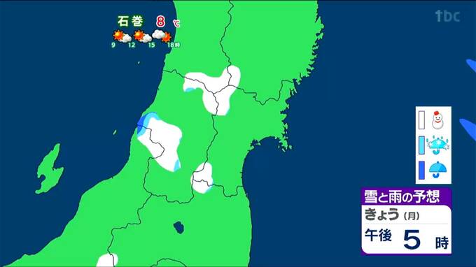西部を中心に雨や、標高の高いところでは湿った雪が降る見込みです。東部の方にも何度かにわか雨が流れ込んでくることがありますが、特に強い降り方にはならない見込みです。