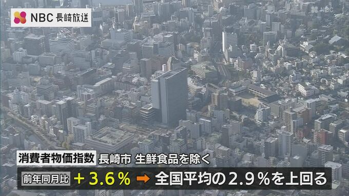 一方、長崎市の生鮮食品を除く「消費者物価指数」は、前の年の同じ月と比べて3.6%の伸びとなっていて、全国平均の2.9%を上回っています。