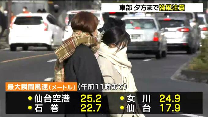 冬型の気圧配置の影響で県内は西寄りの風が強まり、午前11時までの最大瞬間風速は、仙台空港で25.2メートル、女川で24.9メートルなど、25メートル前後吹いたところもあります。
