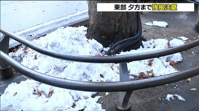 15日朝の県内は冷え込みが弱く、最低気温は、石巻で5.2度、仙台で5.8度など、11月中旬並みとなりました。仙台市中心部では、14日積もっていた雪はほとんど融け、道路脇にわずかに残るのみとなっていました。