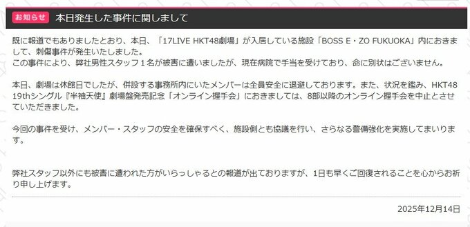 HKT48の声明では、「既に報道でもありましたとおり、本日、『17LIVE HKT48劇場」が入居している施設「BOSS E・ZO FUKUOKA』内におきまして、刺傷事件が発生いたしました。」と報告。