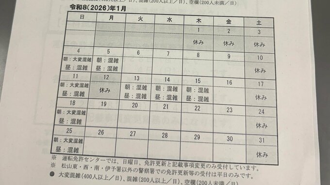 愛媛県警によりますと、年始の日曜日、特に1月4日と1月11日は、平常時の約1.5倍にあたる約1,000人の来庁で「大変混雑」が予測されています。