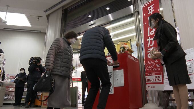 岡山市北区の岡山中央郵便局です。午前9時の受け付け開始にあわせて多くの人が訪れ、門松などがあしらわれた「専用ポスト」に次々に年賀状を投かんしていきました。年賀状は今月25日までに投函すれば元日に届くということです。