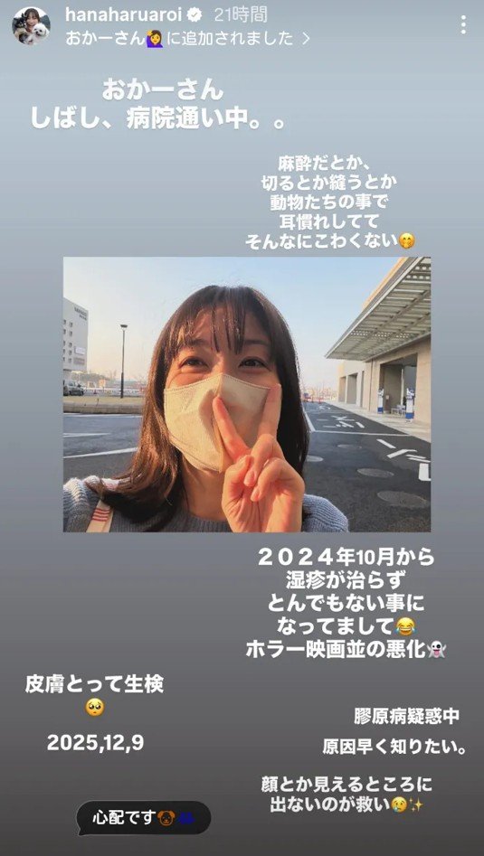 続けて「皮膚とって生検 2025,12,9」「膠原病疑惑中 早く原因知りたい。」「顔とか見えるところに 出ないのが救い」と、状況を明かしました。