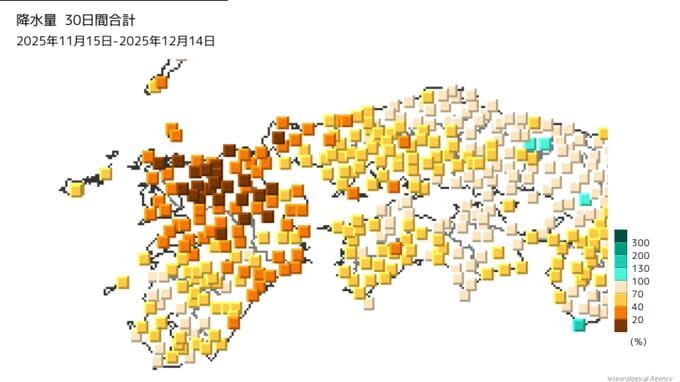 気象台によりますと、山口県、福岡県、佐賀県、長崎県、熊本県、大分県では、10月中旬から降水量の少ない状態が続いています。今後1カ月程度も、まとまった雨は期待できない見込みです。気象台は15日「少雨に関する九州北部地方(山口県を含む)気象情報」を発表し、農作物や水の管理などへの注意を呼び掛けています。