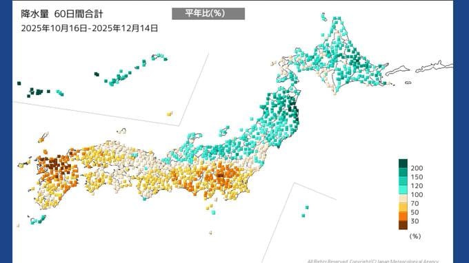 九州北部で「深刻な少雨」平年の3割以下も 山口、福岡、佐賀、長崎、熊本、大分 農作物・水管理に注意【気象庁】 長崎放送 2025年12月15日(月) 14:43 国内 今後も「まとまった雨」期待薄 気象台は、向こう1か月程度も雨の降る日はあるものの、これまでの少雨を解消するような「まとまった雨」が降る可能性は小さいと予想しています。 このため、農作物の管理や、水の管理などに十分注意するよう呼びかけています。