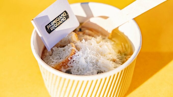 今回、ピックルボールの試合会場には、パルミジャーノ・レッジャーノがテーマのキッチンカーも登場。イタリアのトスカーナ地方に伝わる「リボリータ」というスープに、パルミジャーノ・レッジャーノをかけて来場者に提供した。
