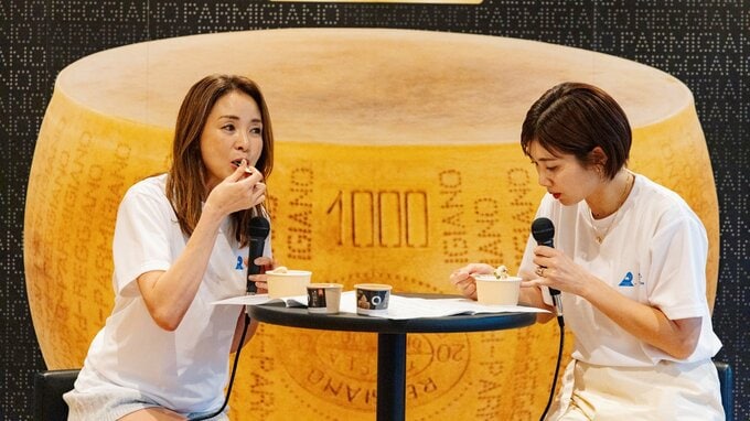 来場者と一緒にパルミジャーノ・レッジャーノを試食するSHIHOさん(左)と潮田玲子さん(右)。