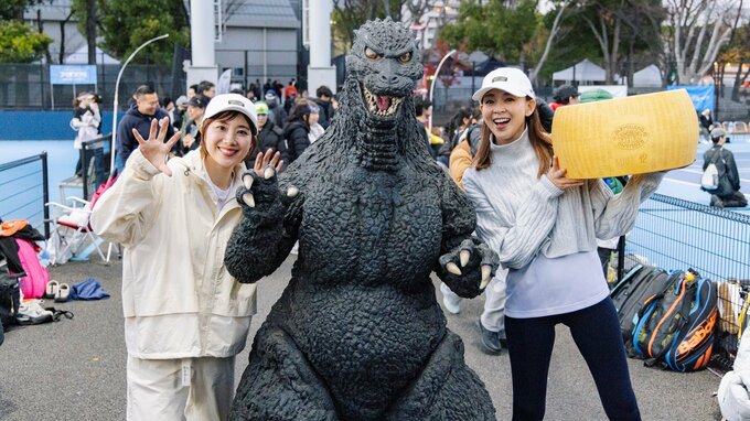 ピックルボール会場に登場した特別ゲスト、ゴジラと一緒に記念撮影。